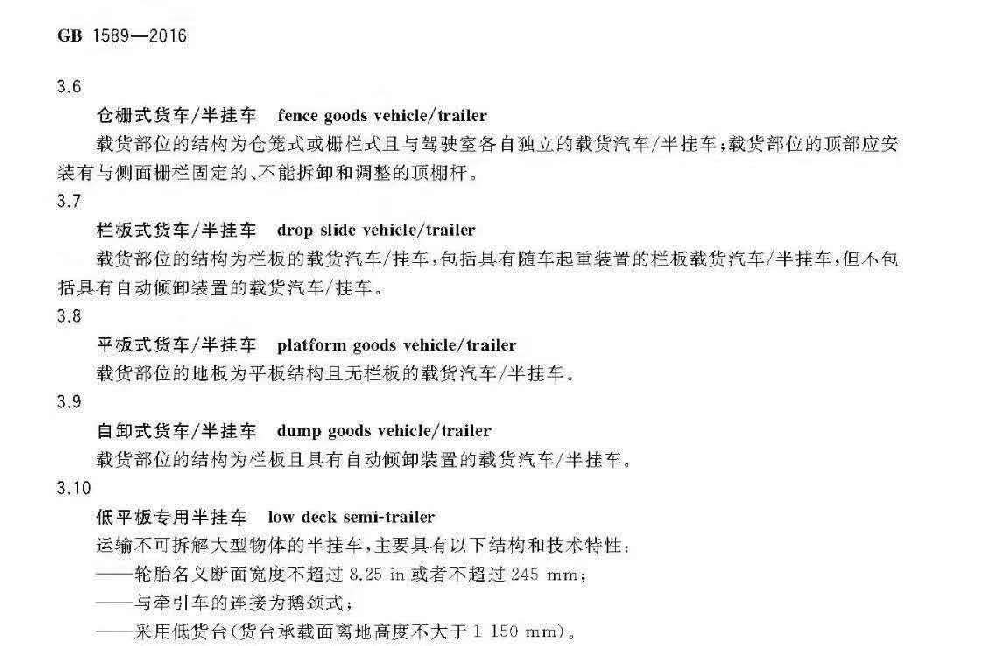 GB 1589-2016 汽車挂車及汽車列車外廓尺寸、軸和(hé)及質量限值